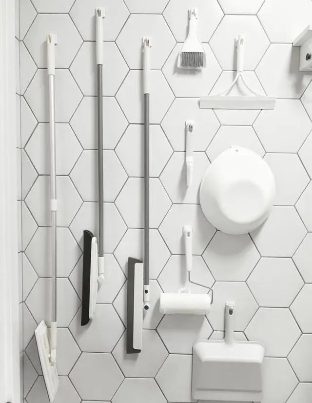 卫生间门后用来收纳清洁工具,相比专门做一个储物柜要简单划算的多,开门的时候被遮挡也不影响美观。清洁工具壁挂起来还能很好的沥水干燥,不会产生异味,直接在卫生间清洗,动线短。