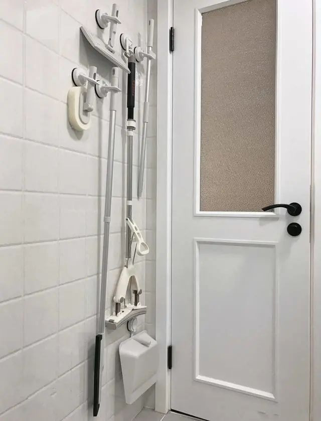 卫生间门后很多人家一直空着,空间就浪费了。其实可以重来收纳清洁工具。